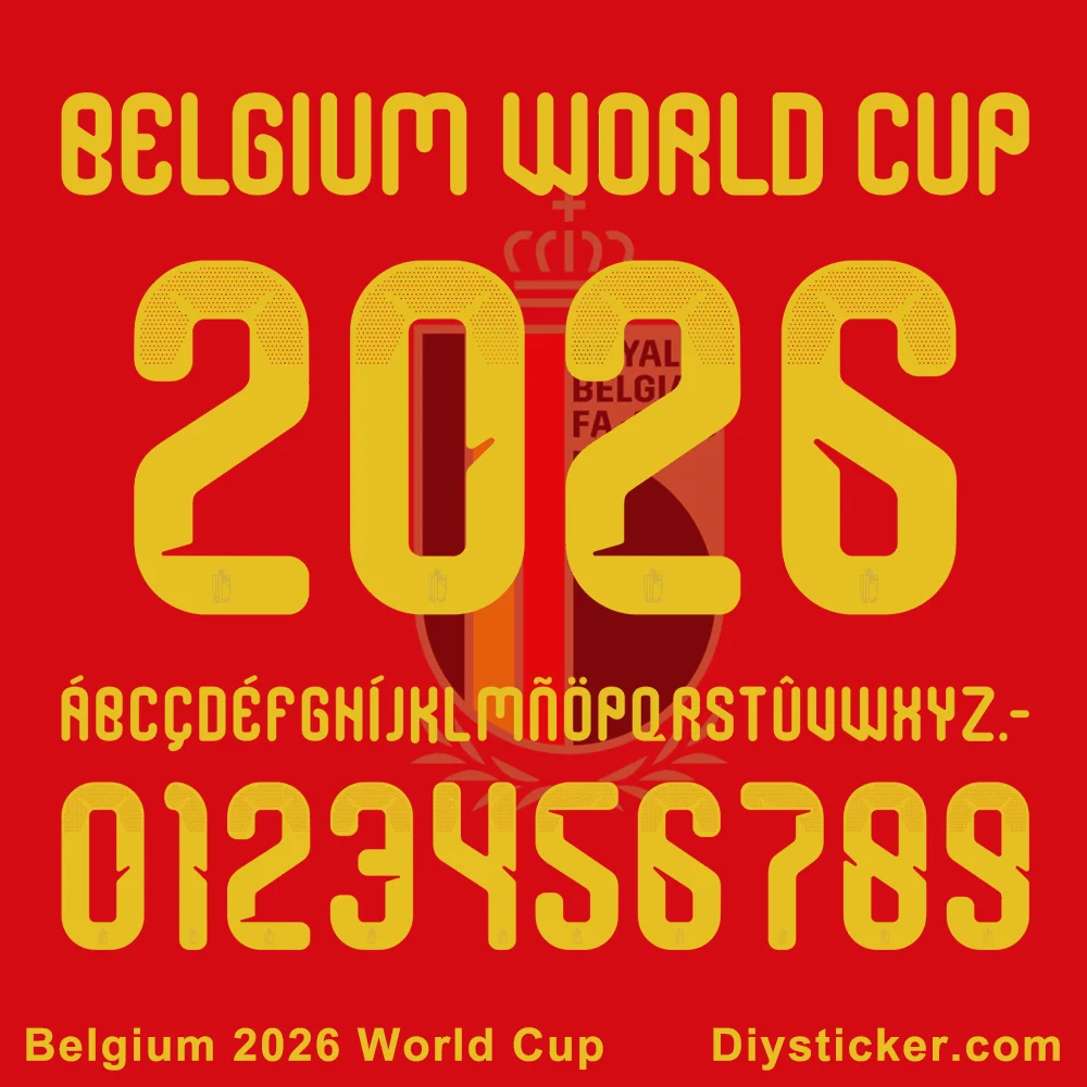 Show your support for the Red Devils with the official Belgium 2026 World Cup Font. This distinctive typeface, featuring unique characters and stylized elements, is used by the Royal Belgian Football Association for its official World Cup kits and tournament graphics.